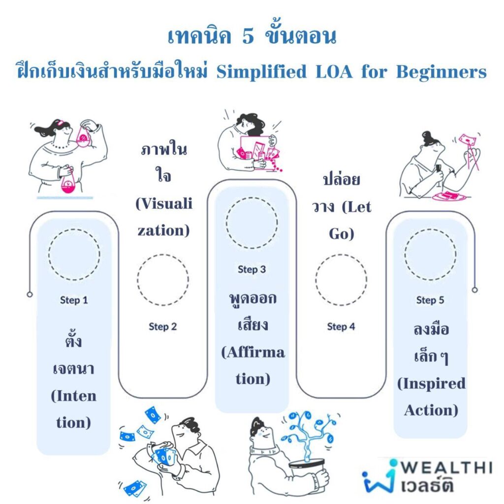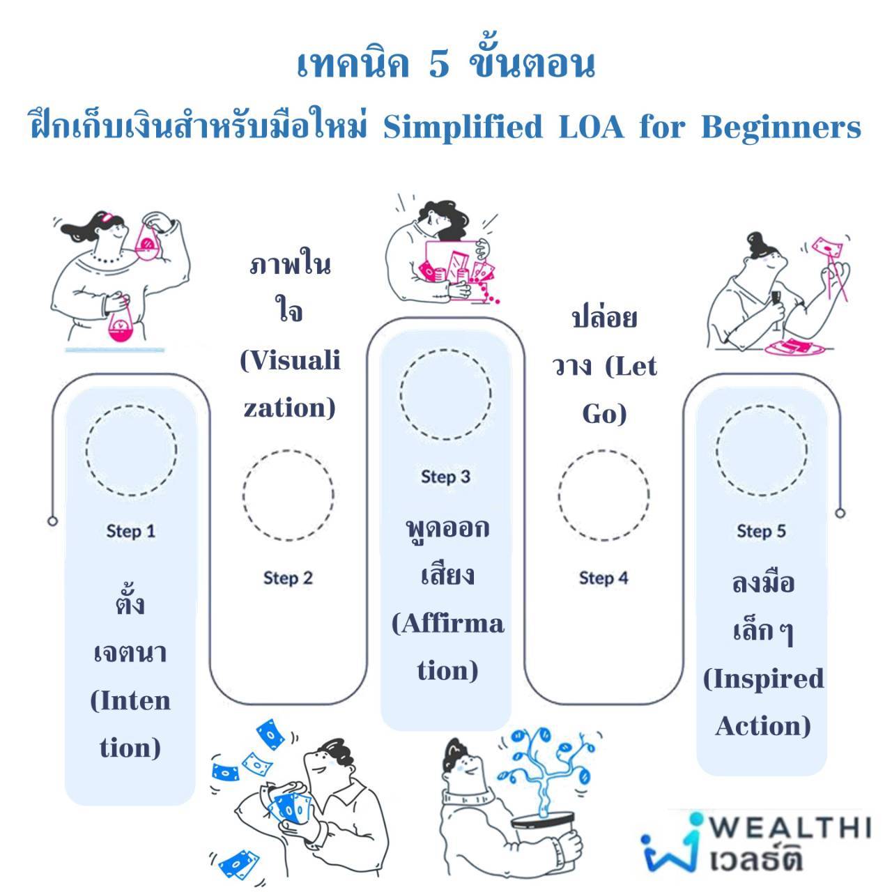 Simplified LOA for Beginners เทคนิคนี้เป็นสไตล์ ต่างชาติ (US/UK LOA coaches) ที่เน้น เขียน-จินตนาการ-พูดออกเสียง-ปล่อยวาง-ลงมือเล็ก ๆ